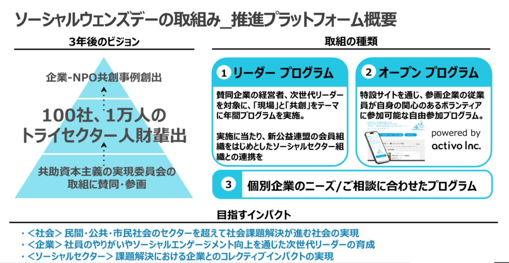 プログラムは大きく2つに分かれ、経営者や次世代リーダーを対象に年間を通じて実施される少人数制の「リーダープログラム」では、社会課題解決に向けた具体的なアクションを生み出すことを目的としています。一方、「オープンプログラム」は、ボランティアに関心のある従業員(ソーシャルウェンズデー参画企業)が特設サイトを通じて自由に参加できます。