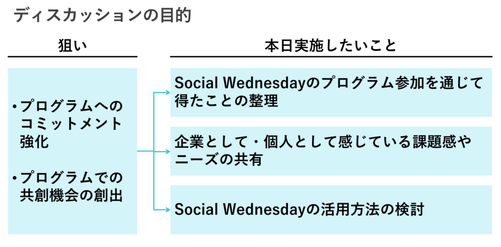 上述した取り組みの共有が行われた後、2つのテーマ「ソーシャルウェンズデーに参加をして得られたもの」と「改めて考える自社の優先アジェンダとソーシャルウェンズデーの活用方法」について、参加者によるチームディスカッションが行われました。