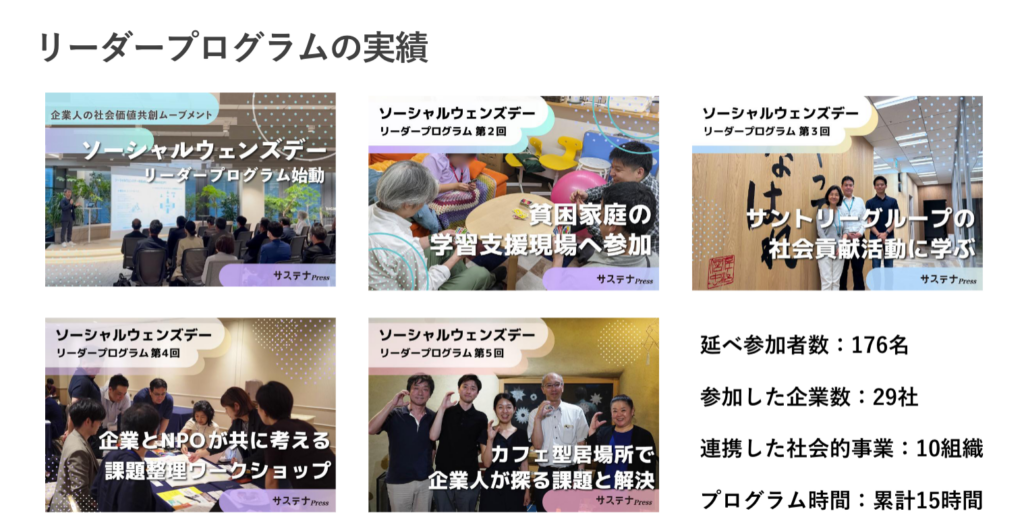 2025年4月から8月に開催された全5回のリーダープログラムには、延べ176名が参加し、29社が名を連ねました。連携した社会的事業は10組織に上ります。