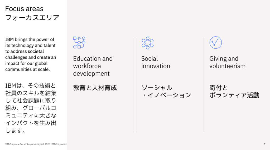 そして現在IBMは、技術と社員のスキルを結集して社会課題に取り組んでいます。CSR活動は、教育と人材育成(Education and workforce development)、ソーシャル・イノベーション(Social innovation)、寄付とボランティア活動(Giving and volunteerism)の大きく3つのフォーカスエリアで構成されています。