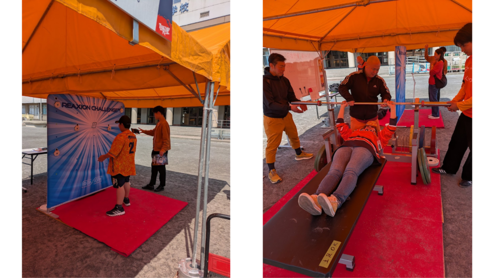 2026年3月28日、クボタスピアーズ船橋・東京ベイのホームゲームで開催されたイベント「ともに生きるともに戦うパラスポーツフェス」にて、パラ・パワーリフティングのベンチプレス体験とREAXIONを同一ブース内で展開し、来場者が自分に合った方法を選んで参加できる体験方法を実現しました。
